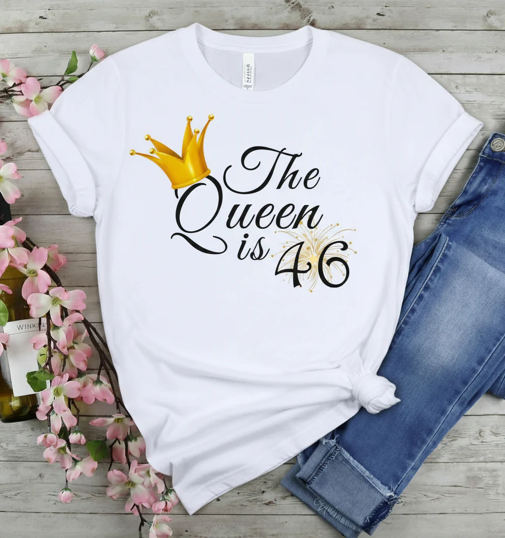 - Queen is 46 vintage t-shirt with original lettering print, for a birthday gift.